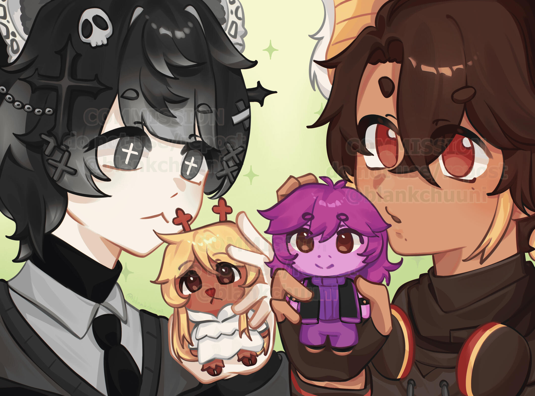 - I will NOT claim the intellectual property (IP) of the commissioned artwork (your characters are still yours, etc.)